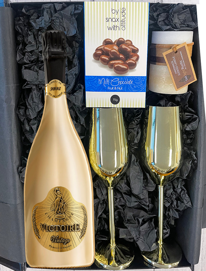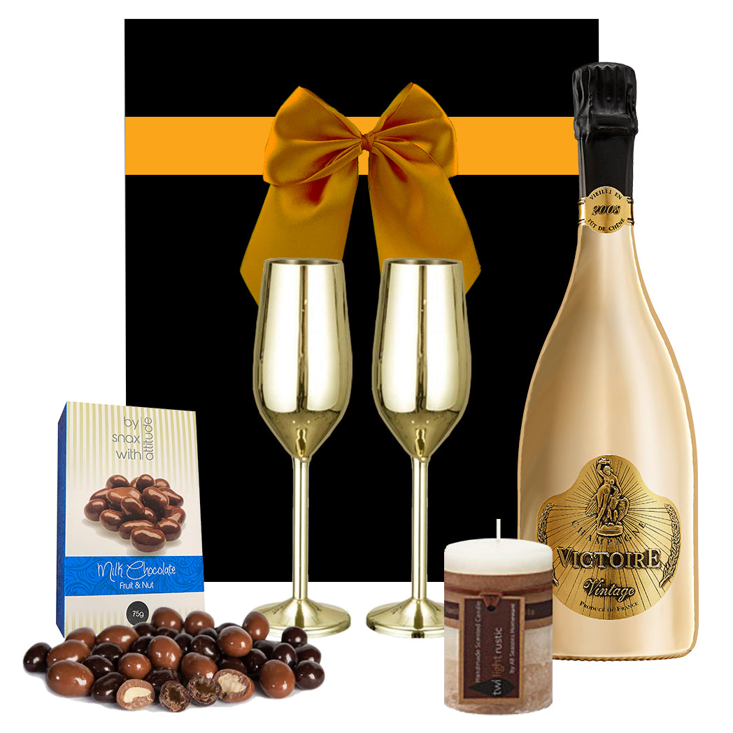 - Victoire French Champagne - this gorgeous champagne comes in a magnificent gold bottle, is bright straw in colour, and has a wonderful fine effervescence with aromas of mango and roses. The true vintage of this champagne appears in an outstanding fresh aftertaste. One of the finest Vintage champagnes available