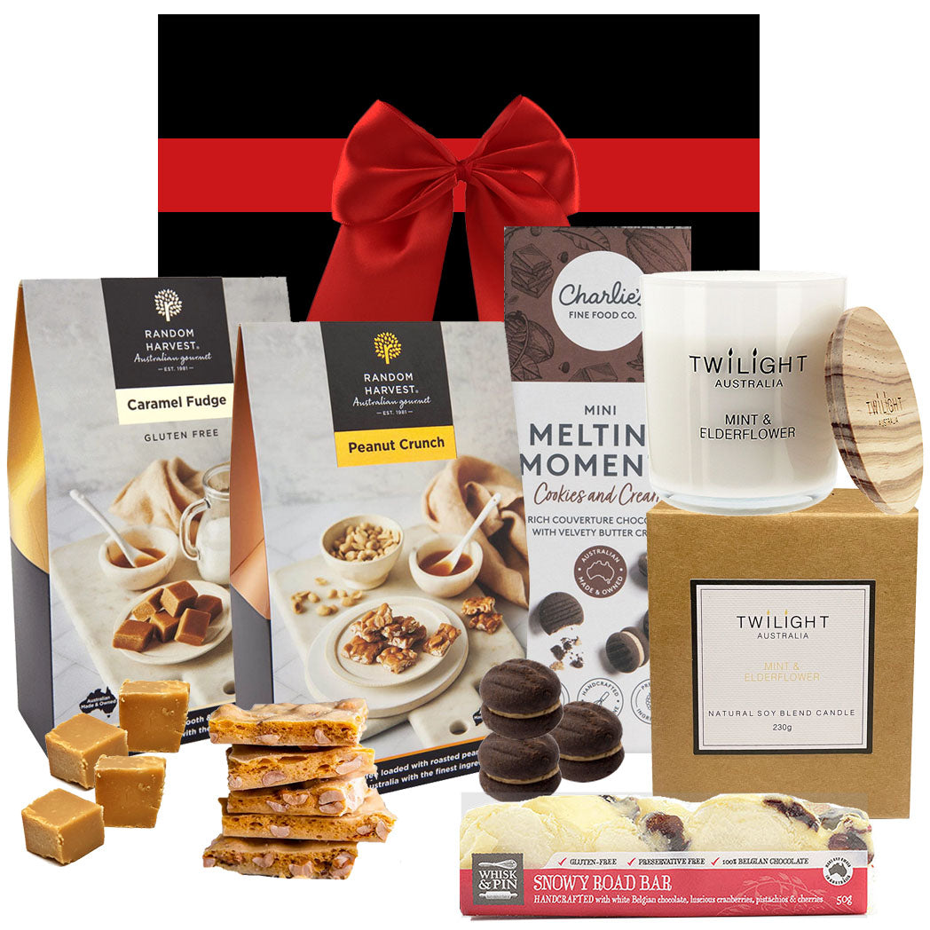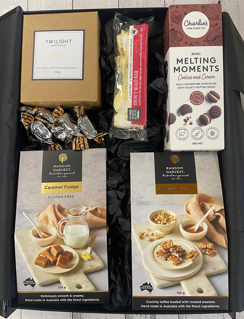 All good stuff… that's what you'll get in this "alcohol-free" gift box. It's all Aussie and and it's all delicious. And while you're eating the goodies, you can light the Mint & Elderflower Twilight Candle and think about the person who sent you this gift. Or you can dance under the moon - your choice!
