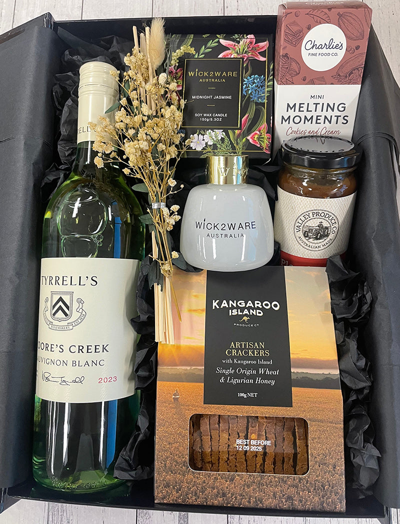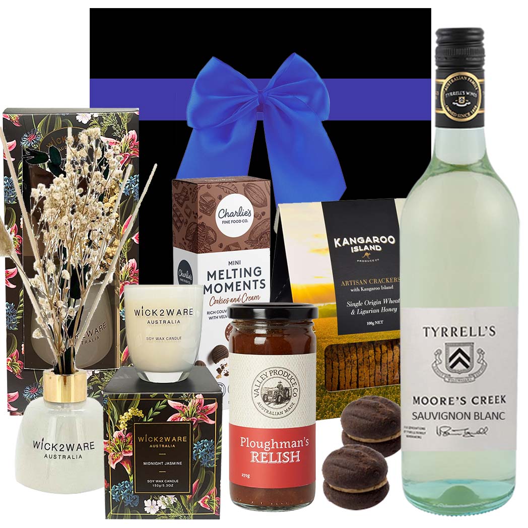 How sweet this gift is. Includes Tyrrells Sauv Blanc, Midnight Jasmine Candle and Diffuser Set as well as sweet and savoury treats. Reminisce the good times.
